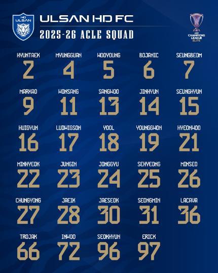 9月3日,Leisu Sports报道说,韩国队UKSAN HD宣布参加参加2025-26 AFC Elite League参加的名册。熟悉中国超级联赛球迷的Malcon,Jiang Xiangyyou和Kim Young-Kwon等球员,由Ma Erkang,Jiang Xiangyyou和Kim Young-Kwon等球员领导。前国际国际球员Lee Qinglong和Zhao Xianyou也被选为名单。上次,乌克桑高清(Uksan HD)在第33届K联赛中获得61分,赢得了冠军,并获得了本赛季亚足联精英联赛的资格。 Ulsan HD AFC Champions League Elite League List: 2-Cho Hyunze, 4-SOO Mingingan, 5-Jung Yong, 6-Bojanichi, 7-Gao Chengfan, 9-Malkang, 11-Yan Won-Sang, 13-Jang Xiangwoo, 14-Lee Jin-hyun, 15-Jung Se-Hyun, 16-Lee Hee-Kun, 17-Ludwigs, 18-Hue-Ru, 19-Kim Young-Kwon, 21-Jiang Hyun-Woo, 22-Kim Min-Hyuk, 23-Moon Jung-in, 24-Yun Jong-Kyu, 25-Kim Se-Hyung, 26-Park Min-Sue,27-Lee Qing-Long, 28-Lee Jae-Min, 30-Yun Jae-Hyun, 31-Yun Sung-Min, 36-Lakva, 66 72-Bai In-Woo,96-joe se-hyun,97 Farias